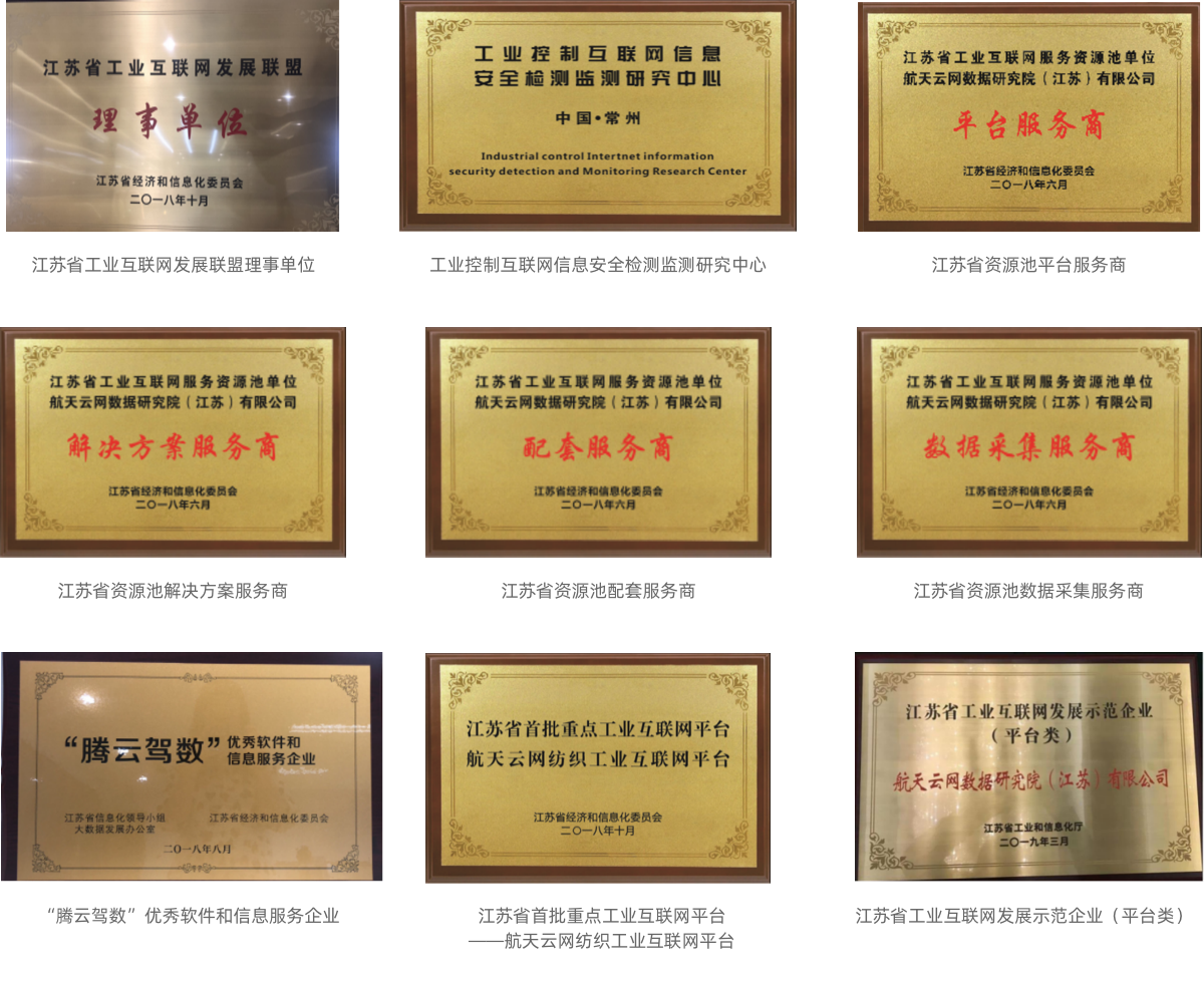 航天云网江苏公司获批工信部认定的2021年工业互联网APP优秀解决方案商、获批2021年度江苏省四星级中小企业公共服务示范平台称号。