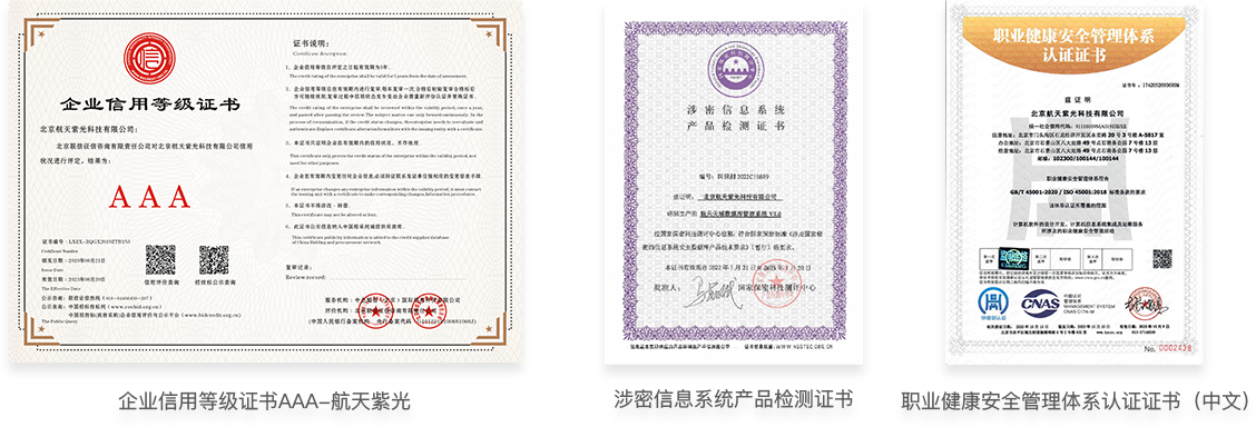 航天紫光公司已取得ISO9001质量管理体系、ISO14001环境管理体系、ISO20000信息技术服务管理体系、ISO27001信息安全管理体系四项认证证书;并且获得ITSS信息技术服务运行维护标准成熟度等级认证、软件产品及软件企业评估认证(双软认证)等多项认证;已正式成为中国电子工业标准化技术协会安全可靠工作委员会会员单位、中国电子商会自主可控技术委员会常务理事单位、绿色计算产业联盟普通会员单位、北京软件和信息服务业协会理事单位等。